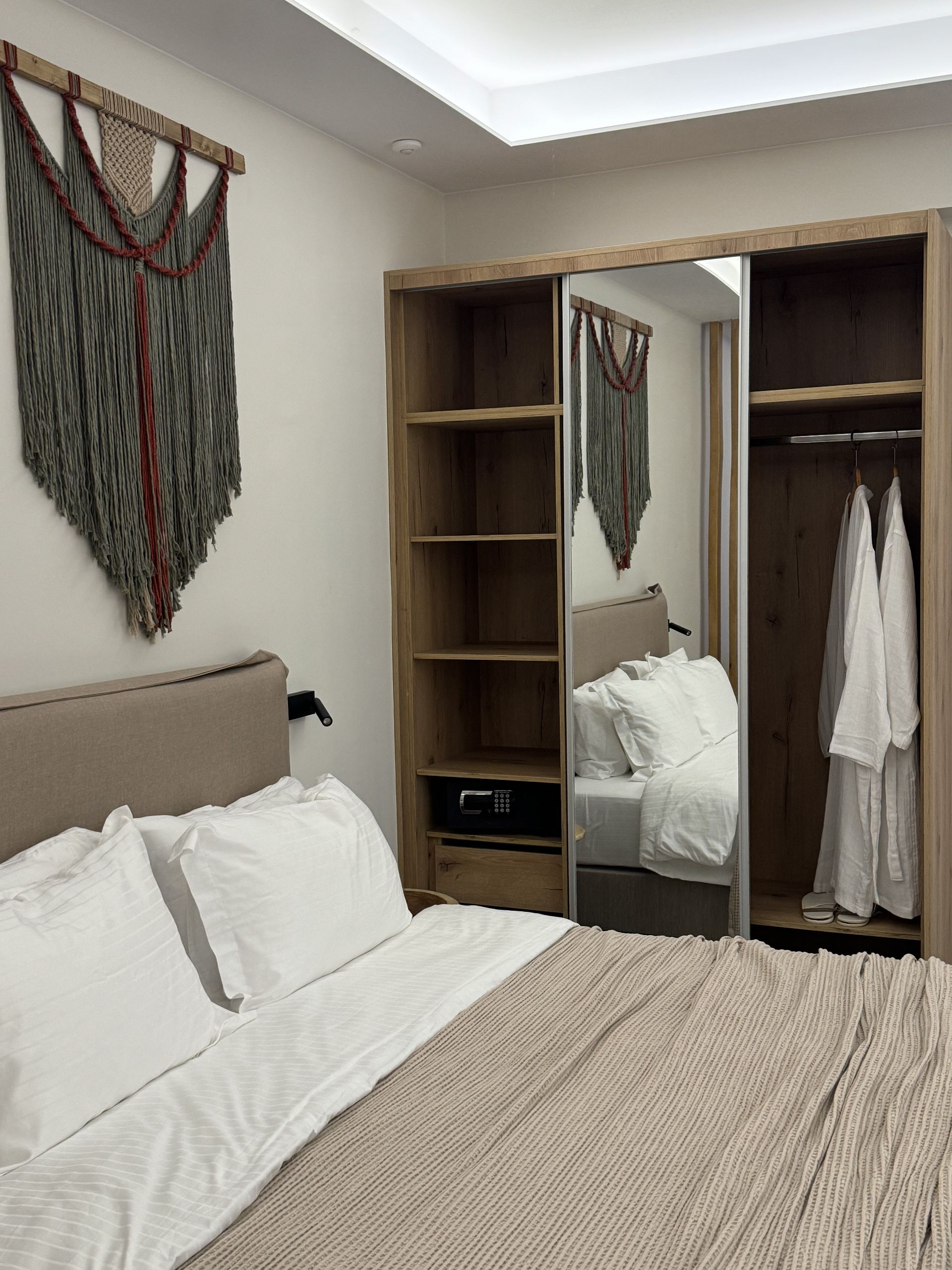 Elegant and more spacious superior double room with garden view, perfect for a peaceful getaway. Relax in the plush double bed or step outside to enjoy the surrounding environment.